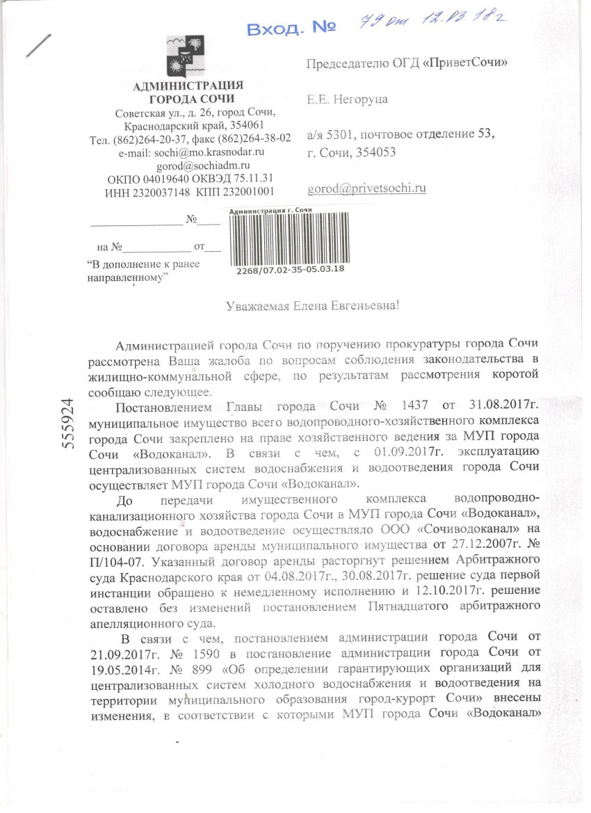 Ответ региональной энергетической комиссии Краснодарского края по тарифам МУП "Водоканал" г. Сочи