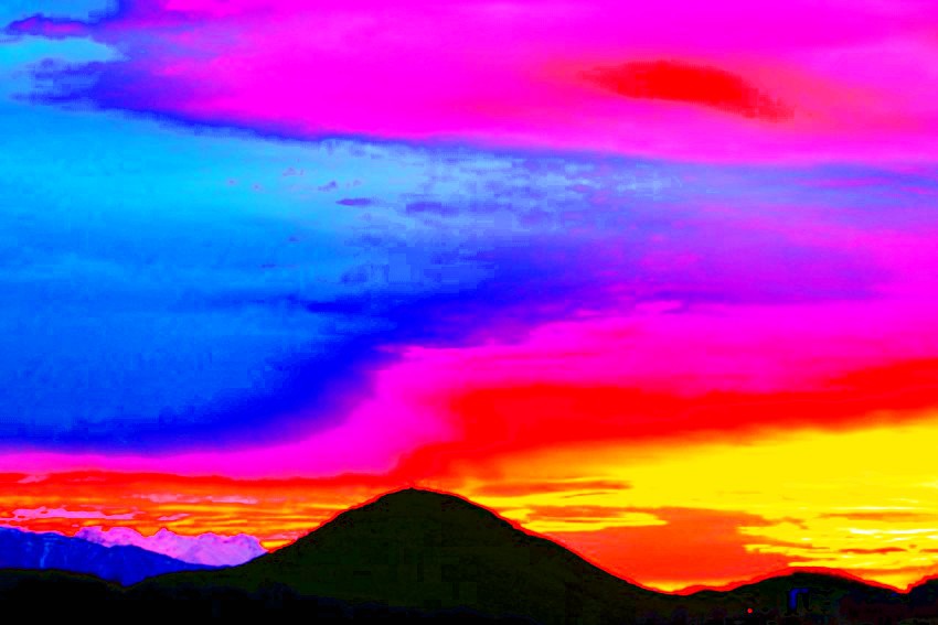 Красок не добавлял, просто сделал яркость, убрав пелену, ведь расстояние очень большое до гор и небес. Радужная окраска небес солнцем при восходе случается раз, два в месяц которую можно снять фотоаппаратом любителю. Красивый закат над морем появляется гораздо чаще.