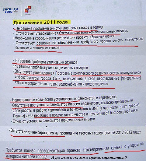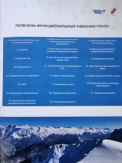 В брошюре почему-то именно это олимпийское наклонение «Еще один шаг на Олимпийскую Вершину Сочи 2014», «Администрация города Сочи играет ключевую роль в реализации Олимпийских задач», так жестко и справедливо отмеченное Путиным как недопустимое для местного чиновничества.
