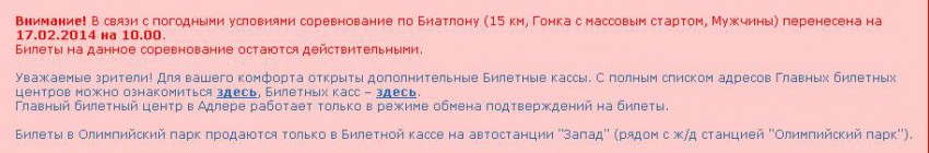 Операторы 8-800-5555-214 сообщили, что перенос соревнования не является причиной для возврата билетов. Что же, ждём предложений здесь, на Привете. Есть желающие купить-продать лишний билет?