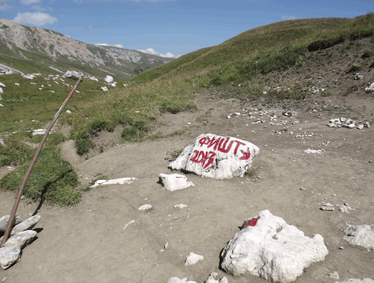 Вот оно крупнее. Это место по легендам считается тем самым местом, где был прикован к скалам Прометей. Именно это пятно недавно в интервью упомянул Путин (найду потом чуть позже эту видеозапись), еще бы ведь ему его отлично видно из его горной резиденции, о которой также позже, возможно, расскажу и которая является камнем преткновения в спорах защитников природы, ведь никакого строительства в Кавказском заповеднике вести по закону нельзя.