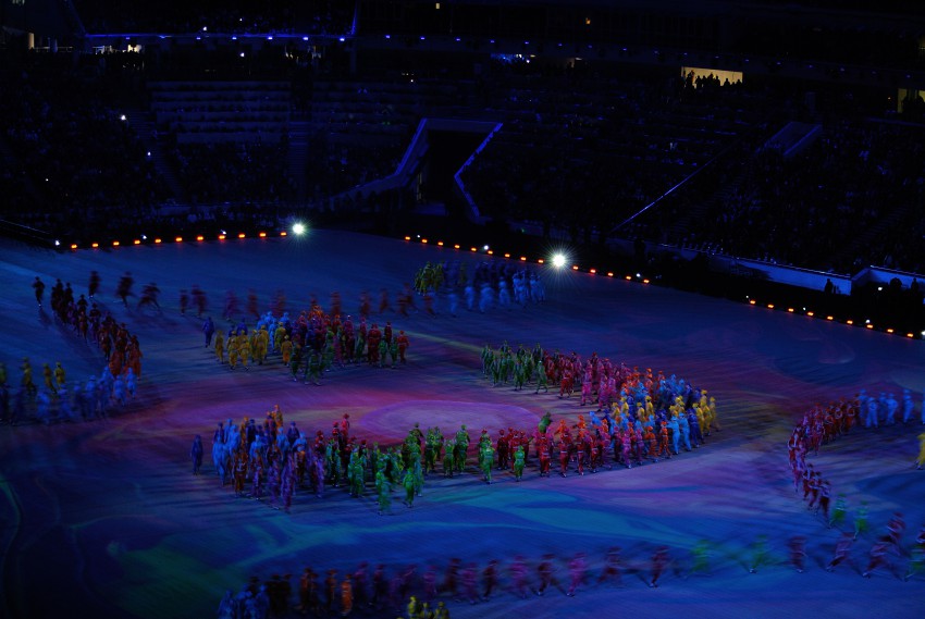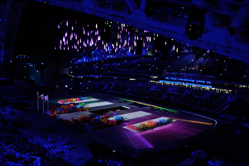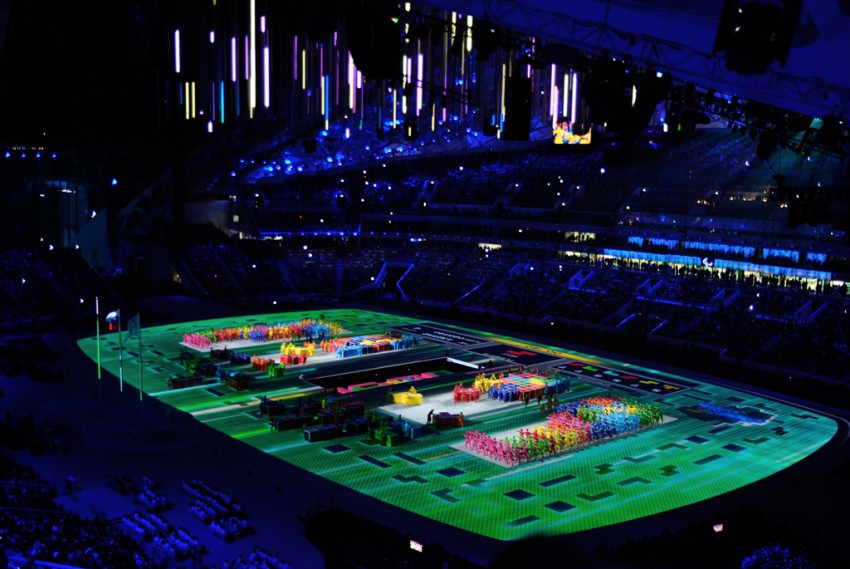 Ну а теперь о самой церемонии. Шоу называлось «Достигая невозможного» Где невозможное становится возможным благодаря силе духа и упорному стремлению к высшим результатам. Перед началом небольшое пре-шоу с выходом спортсменов — паралимпийцев из всех стран — участниц. Хотя на стадионе еще народу маловато, сборную России приветствуют оглушительными возгласами.