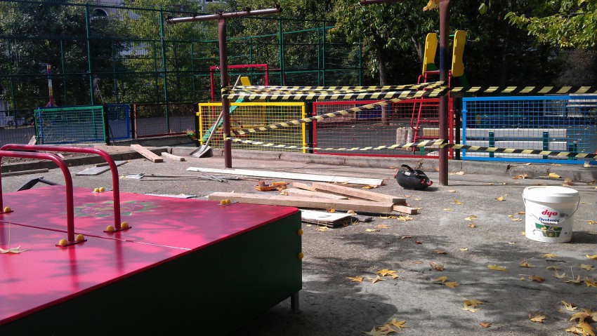 Услышав в понедельник 14.09.2015 г. о том, что инициативная группа жильцов ( в основном, конечно, женщины-мамочки) собирается на субботнике покрасить забор площадки и обшарпанные карусельки, Максим на следующий день привел рабочих с краской, необходимым инвентарем и приступил к благоустройству нашего двора.