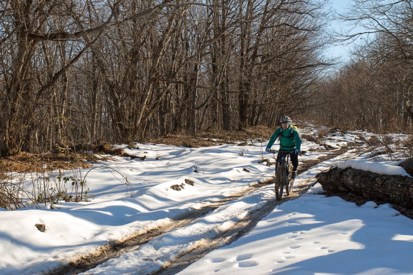 Далее ныряем влево и осуществляем безподобный спуск через по-сочински зимний лес :) Этот маршрут нами проезжался не один раз в разное время года, но по снегу ехали впервые.