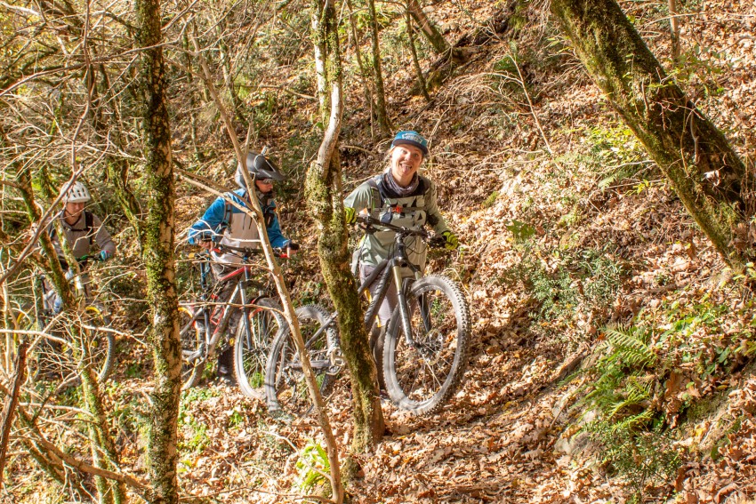 Далее с осторожностью тащим велосипеды вверх-вниз по узенькой тропе, местами проходящей вдоль крутого обрыва. Тропа красивейшая, засыпана сухими разноцветными листьями, только колючки иглицы безжалостно колят голени