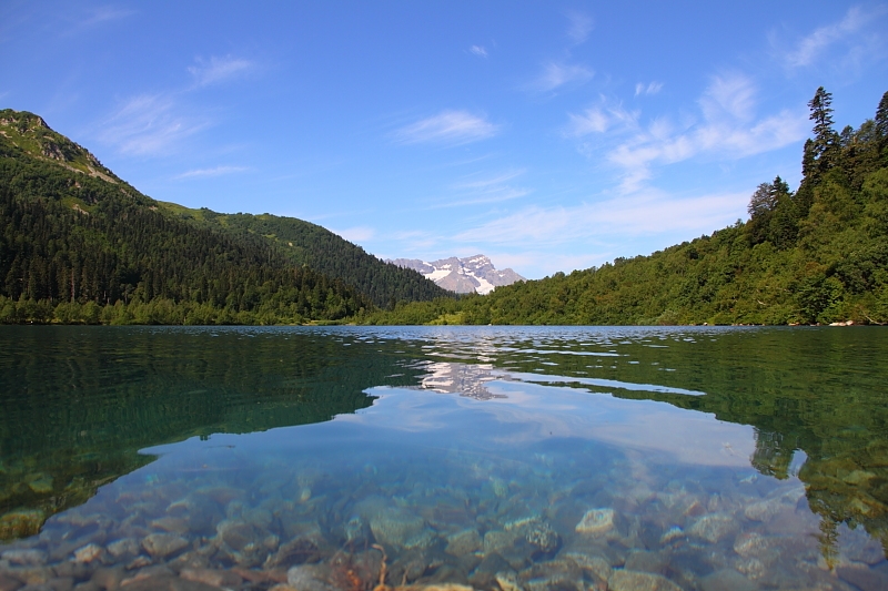 Мзымта тут чистая, спокойная и мелкая… Переходим вброд. Вода такая холодная, что на мгновение становится страшно — ног не чувствуешь.