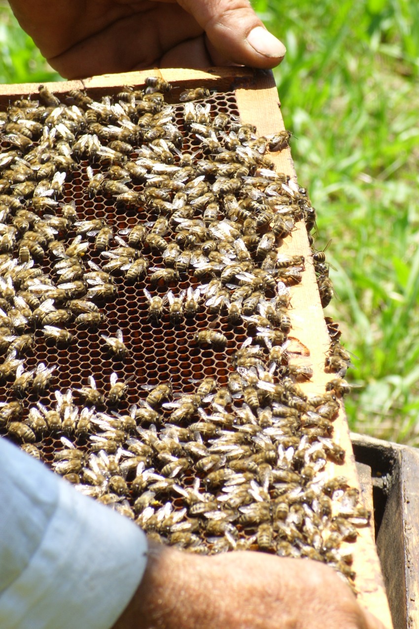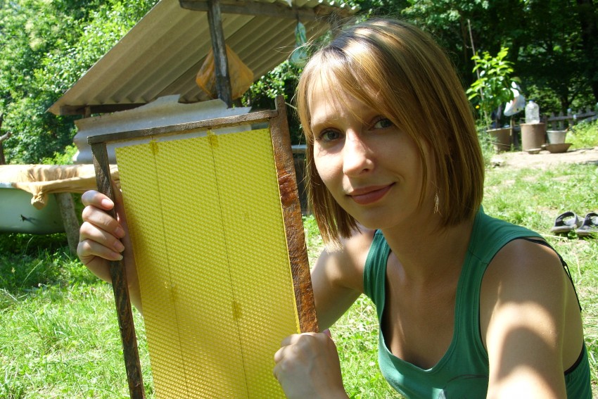 Однако, нам все-таки удалось попробовать свежего меда. Альберт хоть и был очень занят, но постоянных гостей он решил угостить, найдя в очередном улике заполненную рамку с медом.