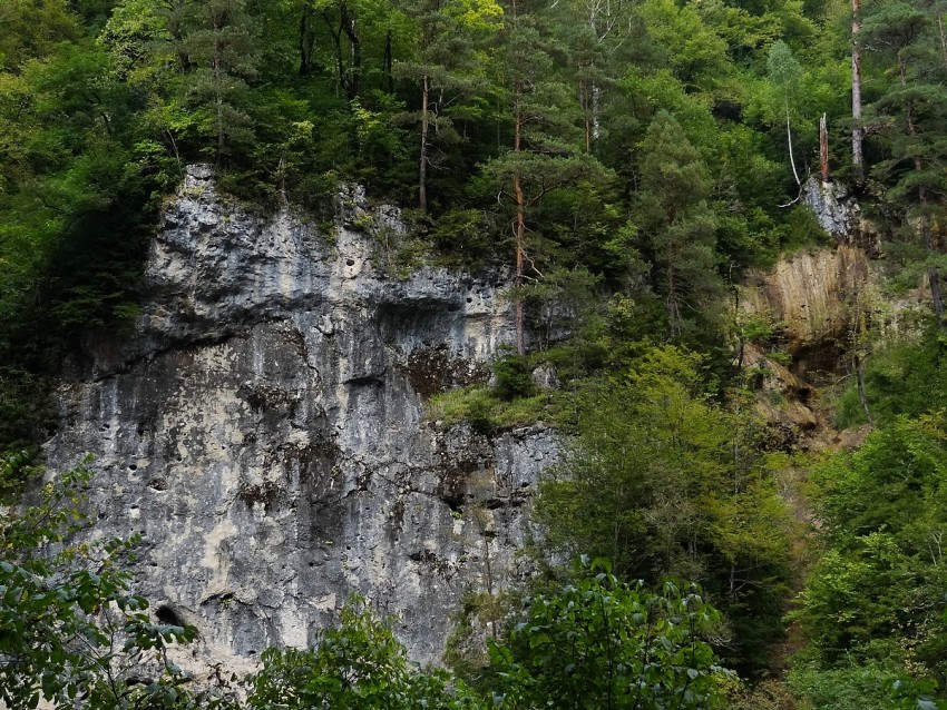 Тропа сначала идет через лес, а потом вдоль отвесных скал