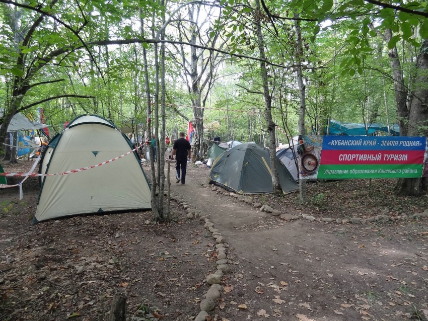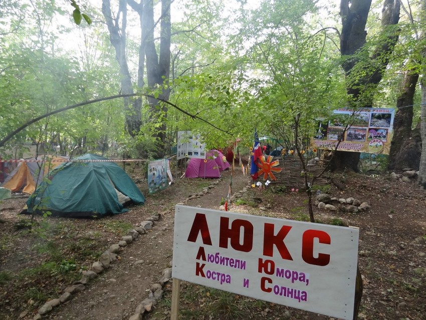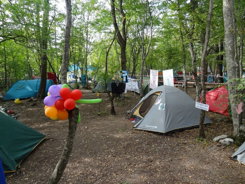 Напротив отеля Гуамка, на другом берегу реки Курджипс, есть длинные ровные лесные поляны, на которых проводятся туристские слеты и фестивали. Здесь, с 18 по 25 сентября проходили краевой фестиваль юных туристов, туристский слет работников образования, соревнования по спортивному ориентированию и краевой туристский фестиваль “К вершинам”. За неделю слетов поляны вместили не одну тысячу человек, число палаток на поляне подсчитать невозможно.