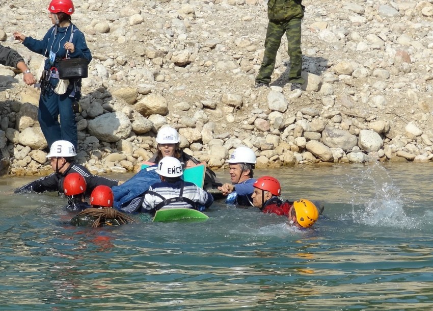 Впереди самый сложный этап – переправа “пострадавшего” через глубокую водную преграду (омут на реке Курджипс).