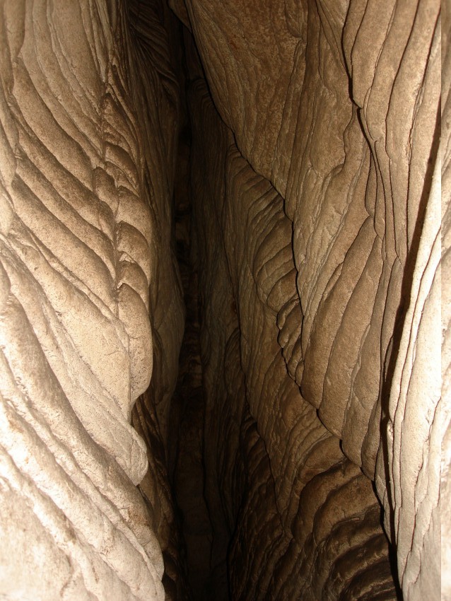 Далее мы спустились к пещере Первомайской (точно не знаю, правильно ли это название, посёлок и совхоз раньше назывались Первомайскими). Пещера небольшая, раньше была оборудована спуском и освещением, но сейчас там только с фонариком пройти можно. Красивая, ходы горизонтальные и очень «фотогеничная»