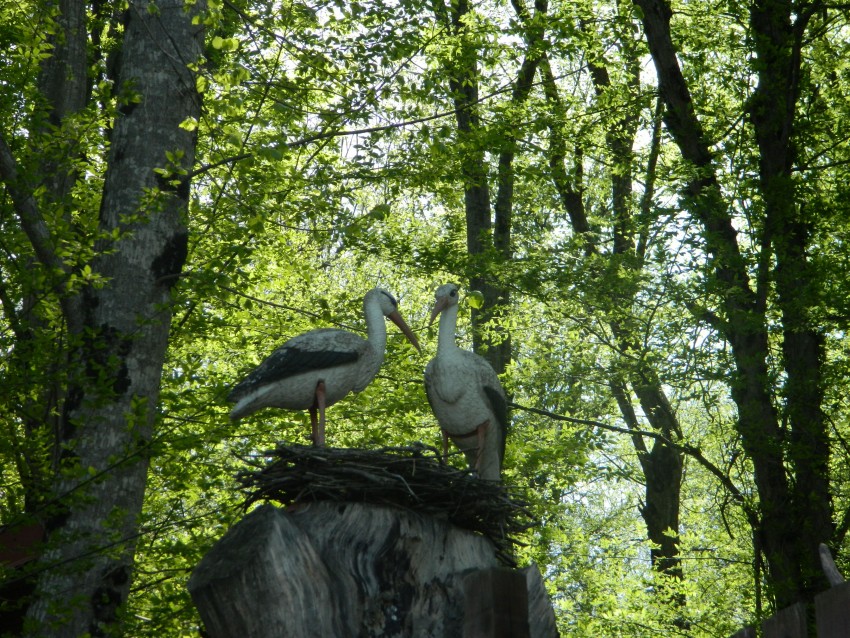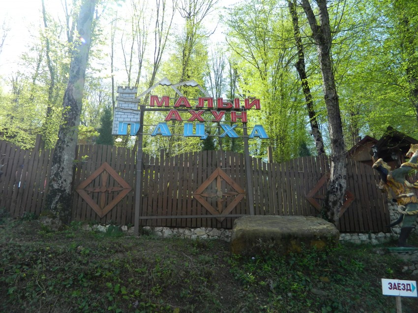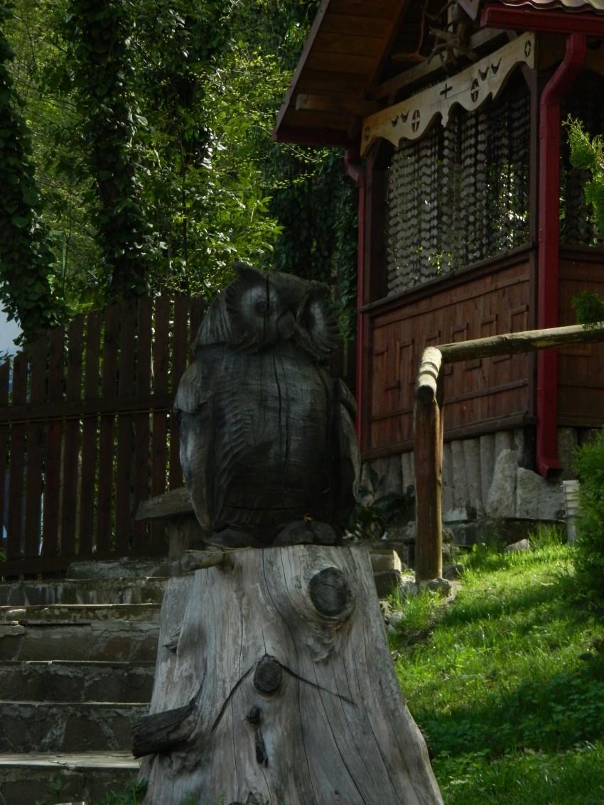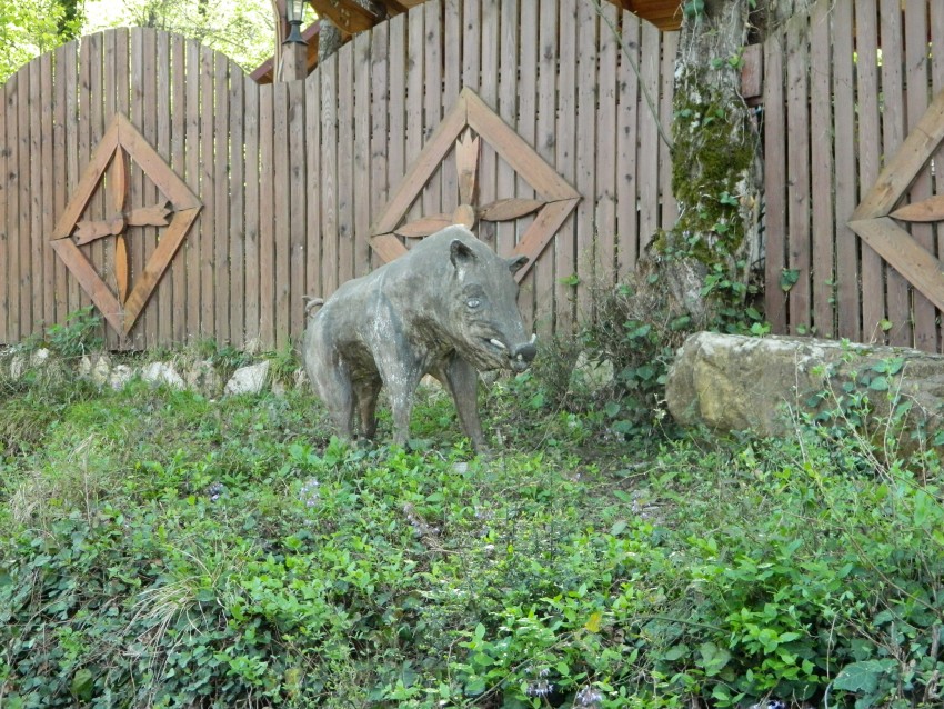 Вышли к ресторану Пацха на территории которого много разнообразных животных вырезанных из дерева: