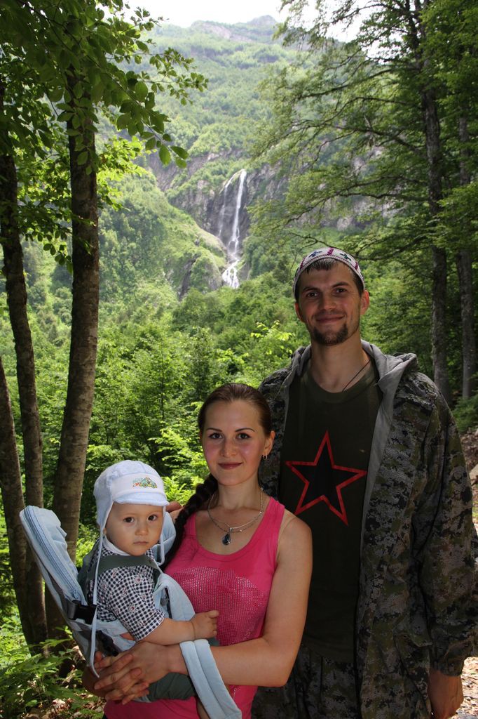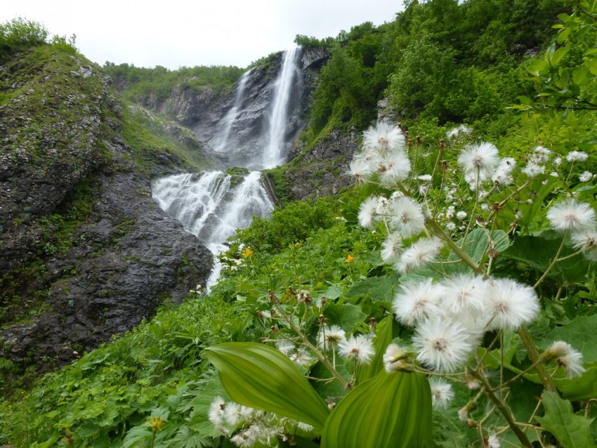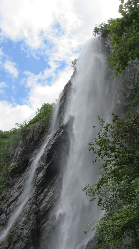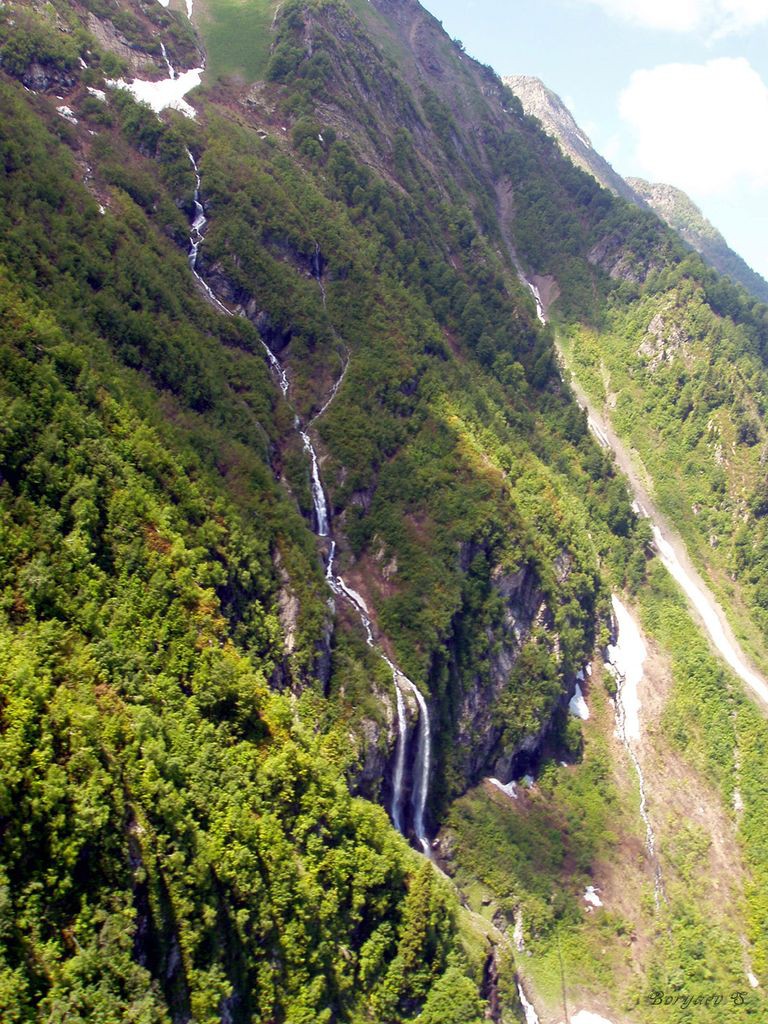 однодневный поход 17го июня 2012г. водопад Поликаря ( в народном фольклёре кличут «Штаны» ) расположен на северном склоне хребта Аибга, по разным данным и критериям оценки высота водопада колеблется от 40 до 70м… вдп находится в субальпийской зоне. Истоки питания водопада это в основном тающий снег Аибгинского цирка и родники…