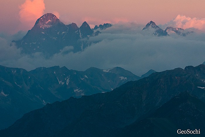 В дымке горы внезапно ставшего труднодоступным Кардывача. Без труда можно узнать характерный гребень Агепсты (3256м).