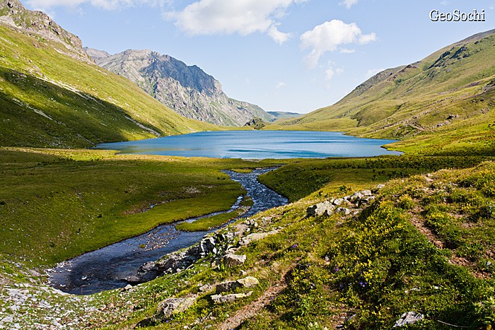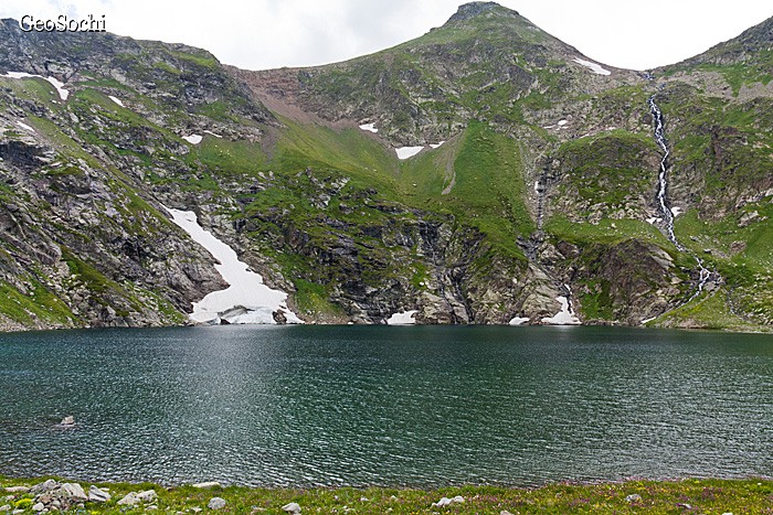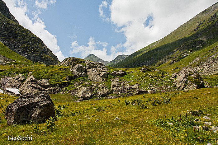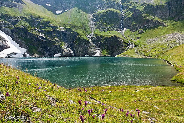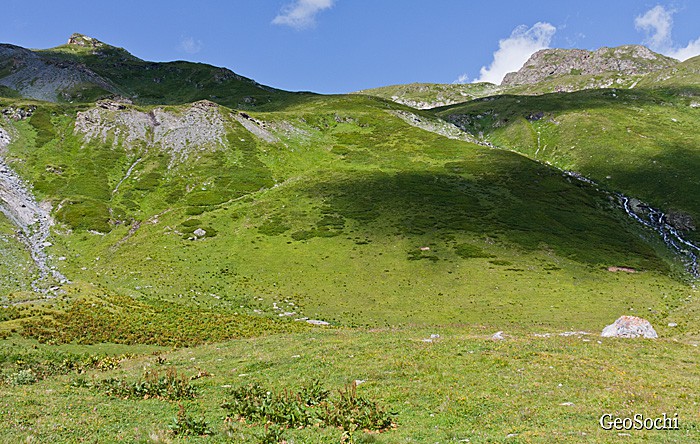 Удивительное дело — участок долины над озером представляет стену ободранных древним ледником «бараньих лбов». Можно представить какой тут был ледопад, по геологическим меркам это было совсем недавно. Однако, следами былых оледенений на Кавказе никого не удивишь. Озадачивает то, что сейчас этот участок долины не имеет постоянного поверхностного водотока вообще.