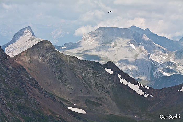 За широким седлом перевала Псыкела, Загеданские вершины Загедан-Скала, Седая и Уруп.