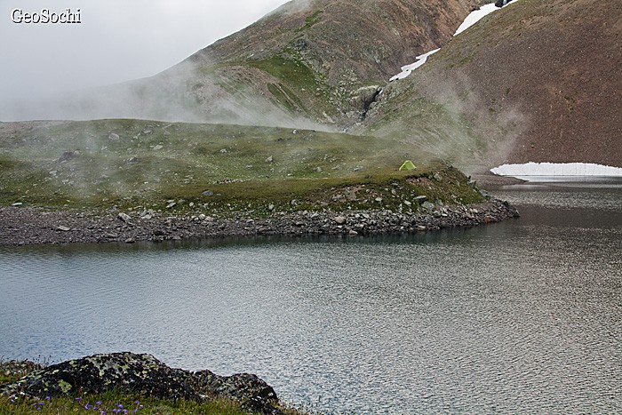 Не прошло и часа как наша палатка стоит на берегу следующего крупного безымянного озера под перевалом Речепста.
