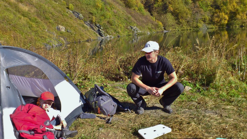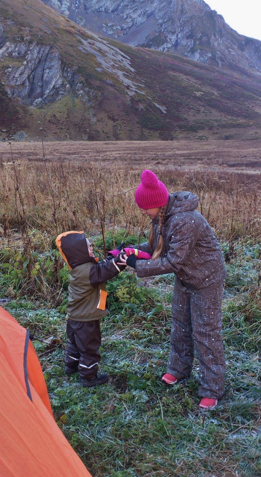 А утром все заиндевело. Палатка обледенела. Ромка проснулся и начал проситься домой, а когда я надела на него остывшую верхнюю одежду и вовсе начал рыдать. Но вскоре он снова возрадовался жизни)