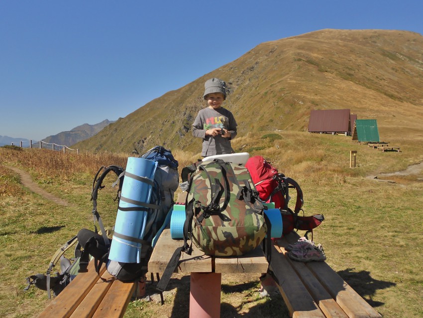 Кстати, этот подъем — единственный ощутимый на маршруте до Бзерпинского карниза, имеет длину 3,800м и уклон 13%, набор высоты по данным GPS составляет 500м. Шли мы в расслабленном режиме и к балаганам вышли часа за четыре. Сын был в восторге, и норовил всюду сунуть свой носик, хотя в горах он оказался уже в третий раз. Тропа радовала — в добрый метр шириной, заботливо избавленная от камней и прочих препятствий — она ИДЕАЛЬНА для велопохода. Велосипедисты! Берите на заметку)