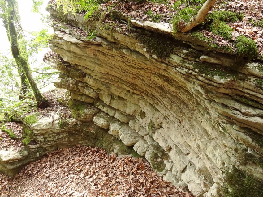 Спуск к скальной полке идет через красивые скалы
