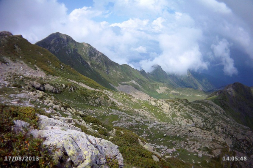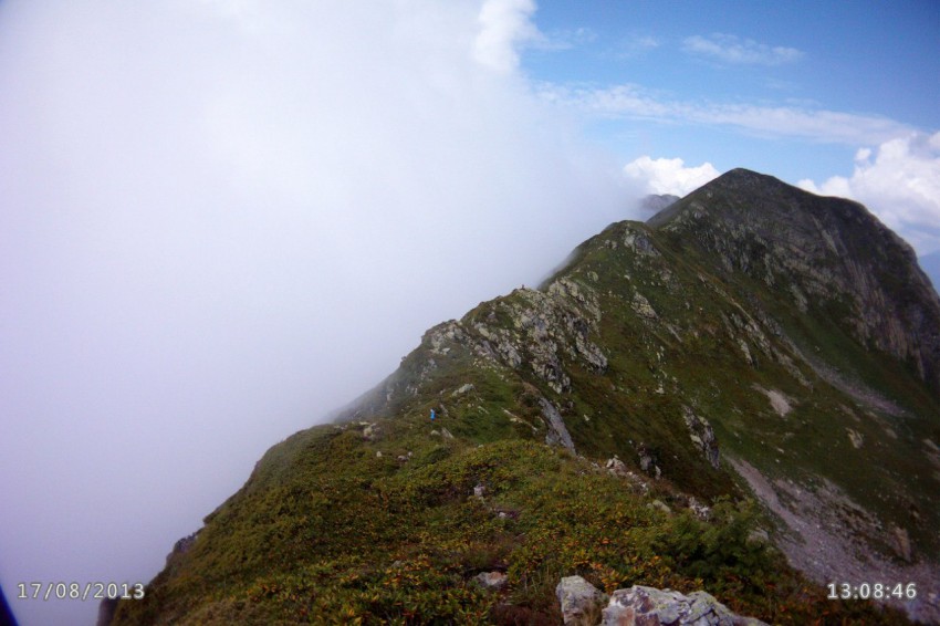 Дальше начинается, по моему мнению, самый интересный отрезок пути до вершины. Верней даже от одной вершины, к другой, по хребту. Но погода довольно быстро начала меняться. Облака переваливались через хребет, и буквально за 15 минут всю Красную поляну затянуло.