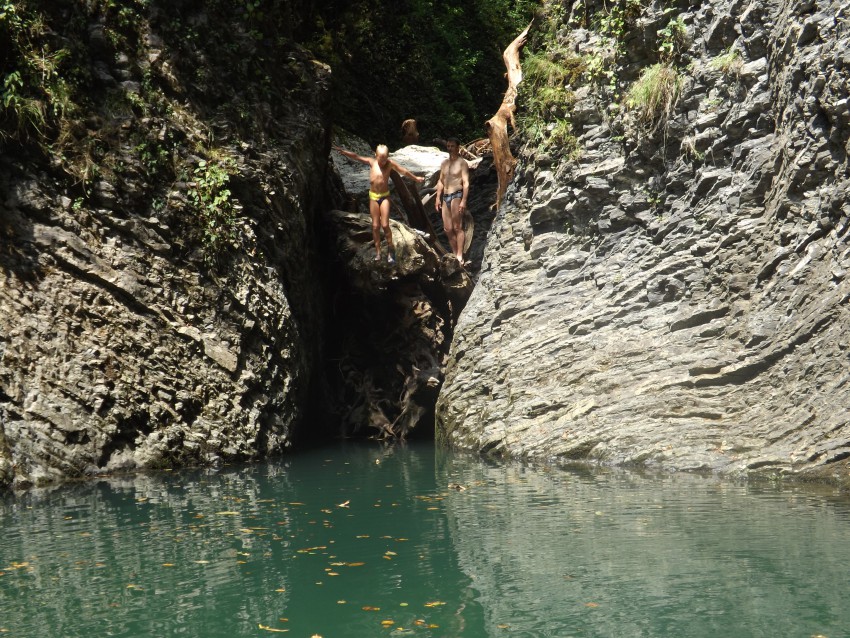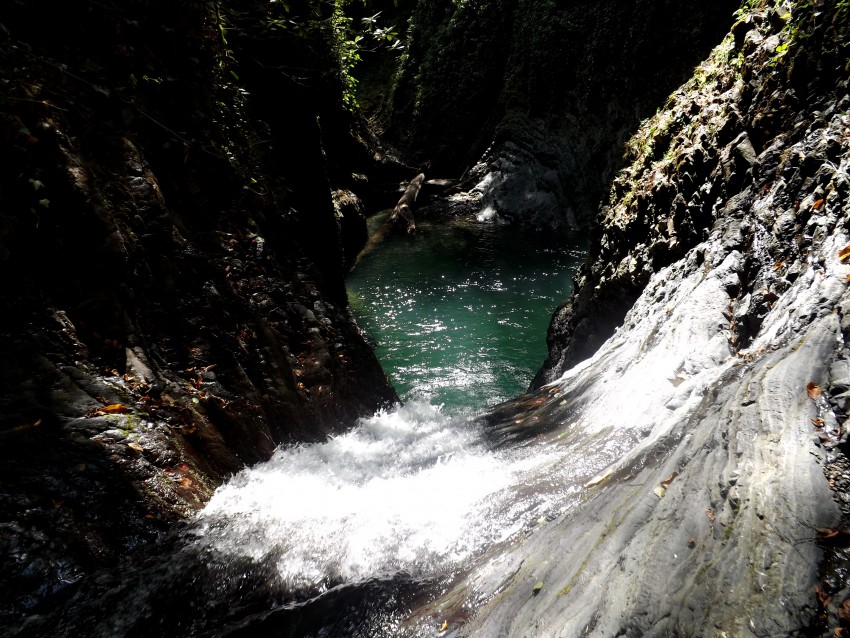 Через полчаса дошли до второго водопада: он выше и обходится по правому краю по скалам. С него тоже можно прыгать, там глубоко, что местные мальчишки там и делали:)