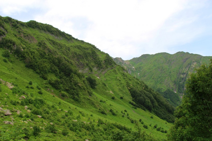 По обеим сторонам дороги возвышаются хребты двухтысячники, а вдали поднимаются отроги главного водораздела Большого Кавказа