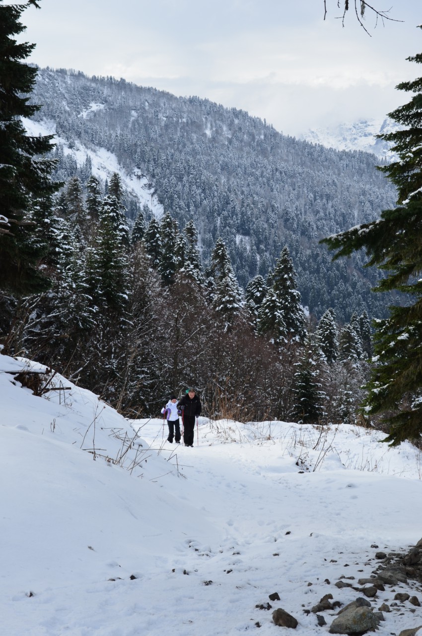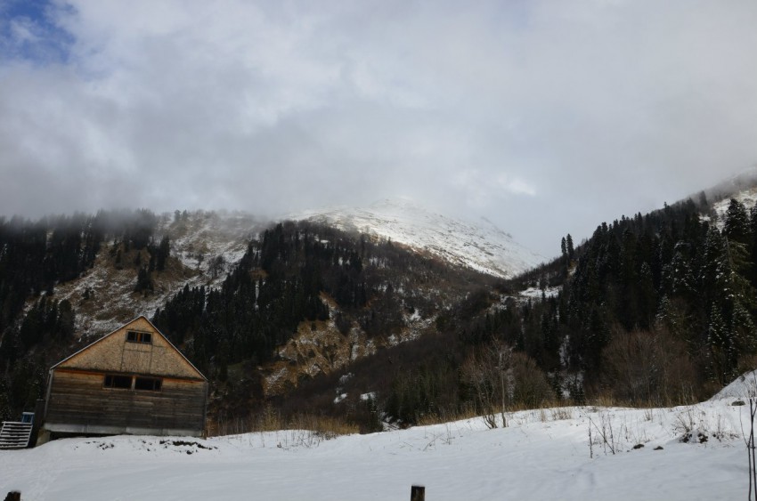 В воскресенье 21 декабря, в 8.30, команда ТурКлуба Глобус погрузилась в легендарный Газ 66 и отправилась в Зимнюю сказку на Балаганы Аишхо. Дорога пролегала от Розы Хутор вдоль реки Мзымта к пограничному кордону, мимо Нарзанов и вверх по территории Нац.парка. Проехав где-то 1,5- 2 часа мы попали в настоящую зиму. Белый снег, величественные горы, и вековые ели- сказка наяву. Наш Газ66 остановился рядом с первыми балаганами на Аишхо, дальше мы пошли пешком, дорога была легкой, снег мягкий, погода радовала своим теплом. Поднявшись на верхние балаганы мы разместились за столиком одного из них и устроили привал, аппетит на воздухе разыгрался не шуточный. Перекусив, мы отправились к смотровой площадке.