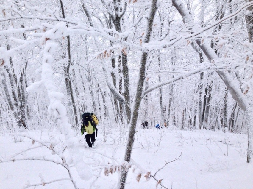 Вернувшись обратно на жд платформу нам пришлось не много пройтись назад по жд путям, где и начанался наш путь на Индюк. Снега оказалось не так много как мы ожидали в среднем 10 см, местами доходило до 20 см. В составе 10 человек мы вышли на маршрут и потопали по тропе, тропа довольна легкая, постоянный набор высоты, чем выше поднимались, тем больше снежного покрова…с тропы мы вышли на проселочную дорогу, и дальше по дороге, видно что по дороге давно уже ни кто не ездит, так как много молодняка растет. Выйдя на ЛЭП начали подниматься вверх, теперь тропа постоянно шла вверх, для некоторых участников нашей группы было не много сложно вато преодолевать подъем, набрав высоту и выйдя на гребень под Индюк, мы прошли две стоянки туристов, но мы решили идти дальше и выше, но выше нас ждал сюрприз. Снежного покрова наверху оказалось в районе метра, и поняли что дальше нам будет все сложнее и сложнее, плюс как всегда Индюк встречал нас сильными ветрами, надувая снежные барханы. Было принято решение остановиться на тур стоянки, спустившись ниже мы начали разбивать лагерь. Согрев чаю и перекусив занялись обустройством лагеря. Наносили дров, разожгли костер и в нашем лагере стало уютно. Вечером нас ожидал вкусный ужин, наши девочки порадовали макаронами с тушенкой. Вечерние посиделки у костра, сегодня мы легли рано, многие в семь вечера.