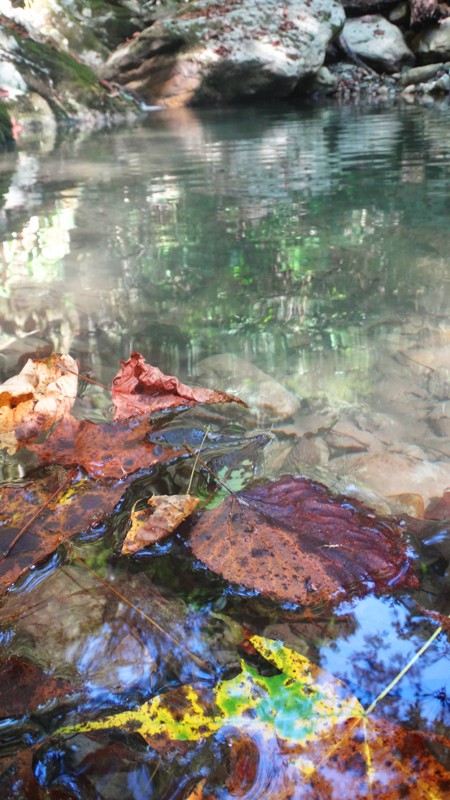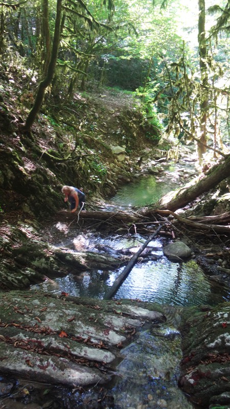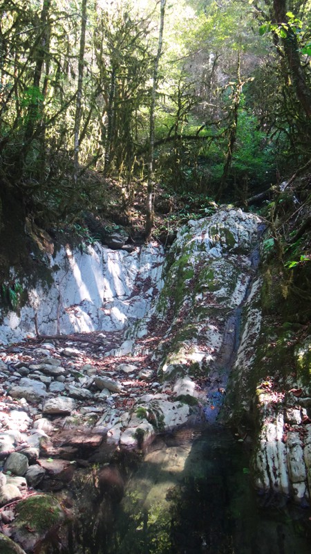 Обратно поднимались в сторону ореховых полян по еще одному маленькому ручейку, впадающему в Хобзу. Он оказался удивительно живописный с небольшими ванночками в известковых образованиях.