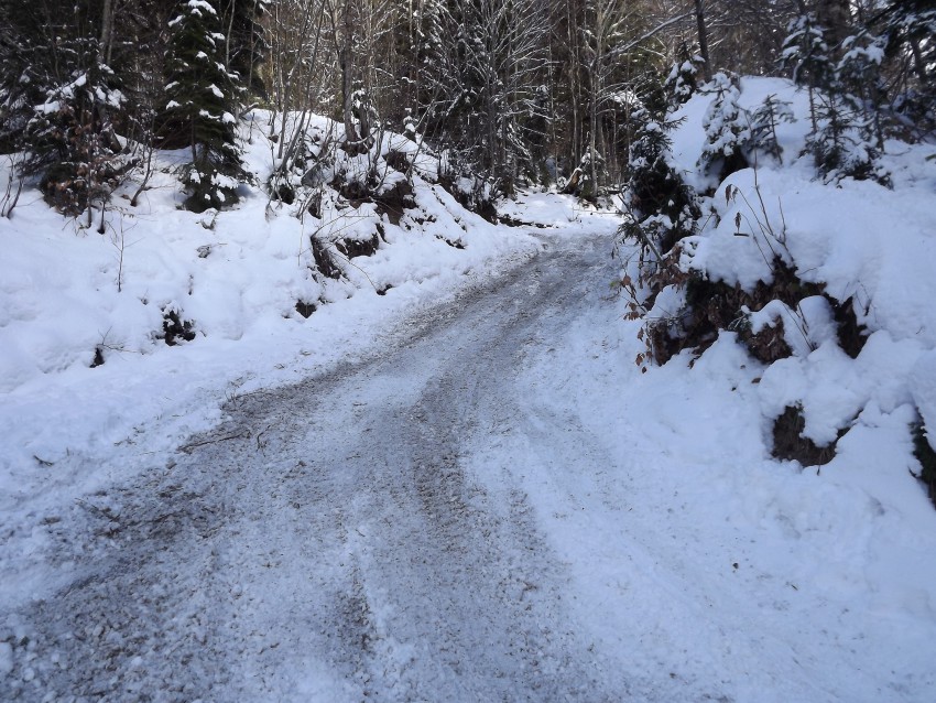 Снега на дороге нет, лед, а в лесу снтиметров 50.