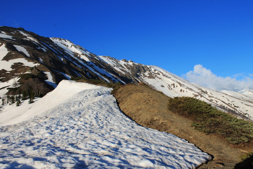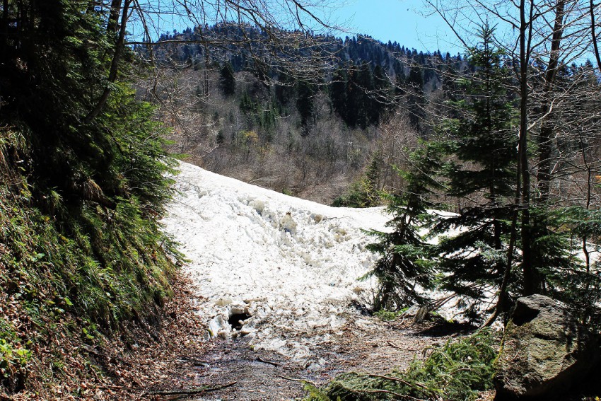 На семиколенке снега нет, а в прошлом году без лебедки было не проехать. Перед Пслушонком дорога упирается в лавину, дальше пешком. Хотя по нижней дороге можно еще немного проехать.