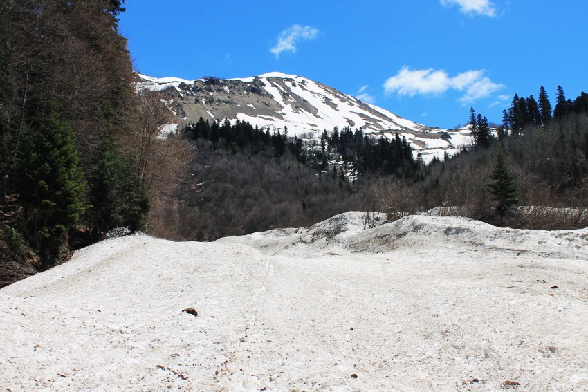 Дальше иду по лавине, " смущают " трещины в снегу — под снегом бежит ручей, который промыл себе дорогу.