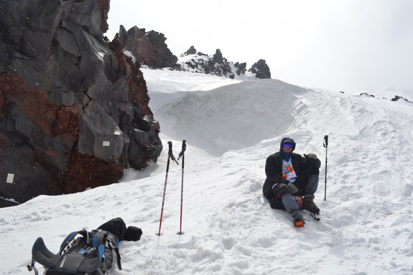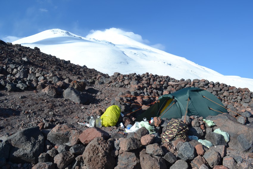 Были на месте около 15:30. Вытащили заброски и разбили наш промежуточный лагерь. Надо сказать, что второй день подряд нас радовала погода. Солнышко, отсутствие осадков, довольно тепло. Не как в прошлом году (штормовой снег, шквальный дождь, минусовая температура ). Эльбрус был «чист». Мало было надежд, что он простоит в таком «выставочном» виде хотя бы неделю. Но хотелось верить.