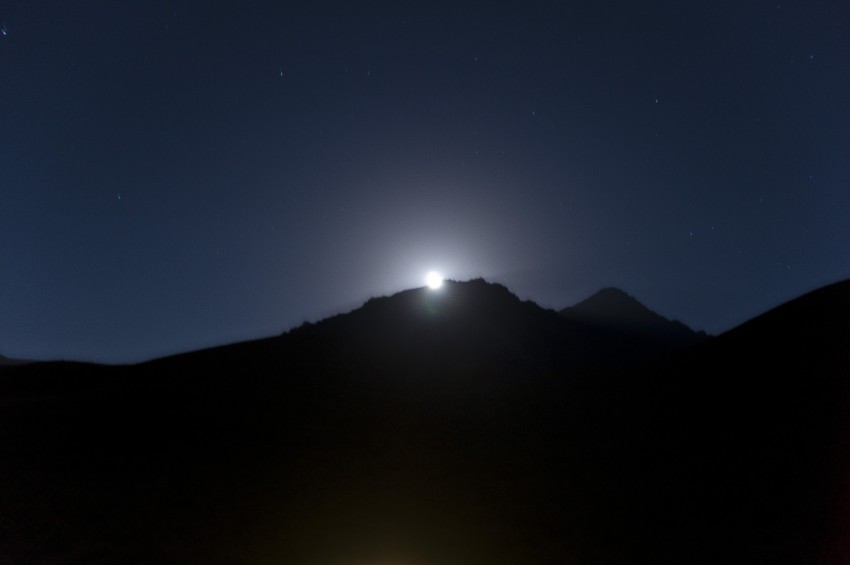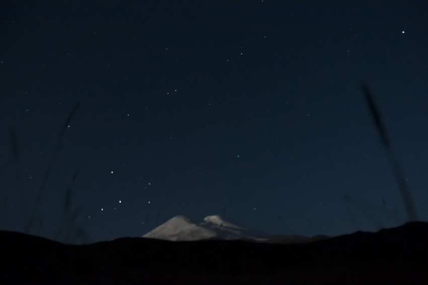 22:00! Все открылось. Облака ушли, Эльбрус под звездным небом! Бужу первого участника (Марата), кому по плану выходить первым. Снаряжаем его, кушаем и он отправляется в 23:45 на вершину. В лагерях ниже наблюдается нешуточное оживление, не менее 7-8 групп готовятся к восхождению. Не мудрено – все ждали «окна» несколько дней. У всех время ограничено. Сейчас! В 1:00, уже 29-го августа, из нашей команды еще двое, я и Илья (два Ильи) тоже выдвигаются на восхождение. Планировалось, что мы догоним Марата на 4500-4900м, где уже вместе продолжим восхождение. Таким образом, я бы контролировал группу, держал в зоне внимания на всем маршруте всех участников. Но догнал я его уже на 4200м. План поменяли – он должен был примкнуть к одной из групп и на их плечах подняться до 5000м в соответствии с его самочувствием, если он почувствует недомогание – немедленно повернет назад. Илья идет рядом. Разрываюсь с ним максимум на 100 м. Вижу постоянно. Несмотря на то, что ночь, налобные фонарики, метель и летящий в фас лед. Небо ясное, а ветер штормовой как в трубе ЦАГИ. Иногда даже бросает из стороны в сторону. Кошки держат на льду. Связываться не стали. Радует, что ветер стабилен, без усиления и небо звездное и чистое. Значит есть уверенность, что все удастся. Сегодня.