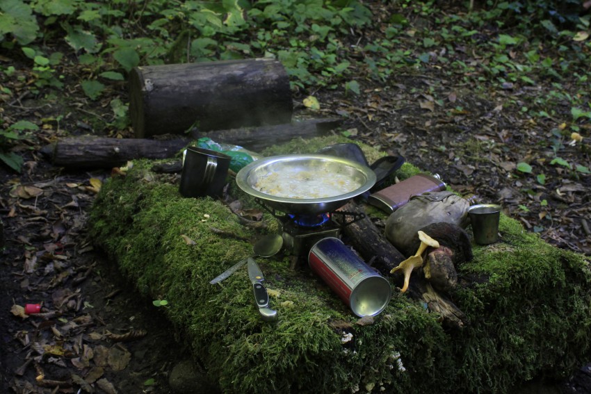 Готовлю обед. Благодаря моим провожатым обед шикарный: лапша с мясом, лисичками и дубовиком. Ну и рюмочка коньяка подаренного мне Андреем два дня назад в верхнем балагане.