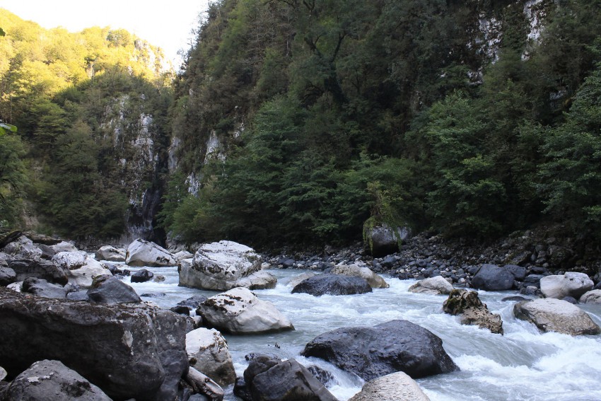 на Чхо, Чха или Анчхо, после войны и развала СССР названия все перепутались, но белая собака, которая за мной увязалась, сильно хромала и два дня ходьбы по скалам не выдержит, а бросать животное не хотелось. Принимаю решение идти вдоль Бзыби в Псху.