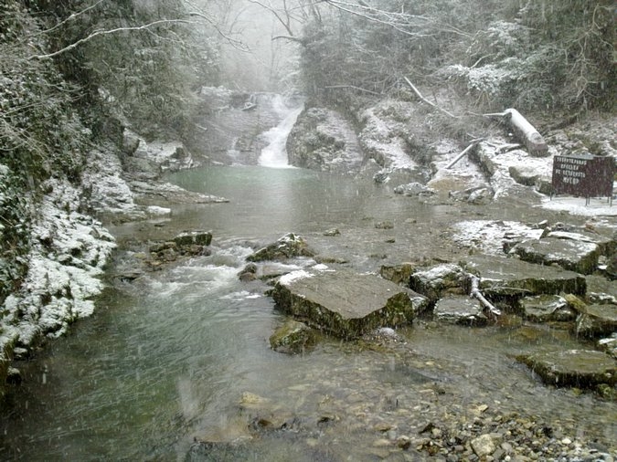 Последний поход, 13 февраля, сбор был в Дагомысе в 7 утра. В тот день на пляж Маяк выбросило очередной сухогруз и все наверно помнят, какая была погода. На автобусе поднялись на перевал Верхнерусское Лоо, там вместо дождя шел снег и сильный ветер, но мы пошли. Нас было всего пятеро, включая Новикова. По снегу начали спуск к истоку реки Мецкет ( а не Киет, как написано в обьявлении, Новиков все напутал, хорошо у меня был с собой GPS и карта). Но по руслу пройти не смогли, пришлось снова выгребать вверх на перевал, проваливаясь в снег по колено и выше, и спускаться по другому отрогу.