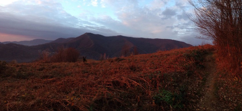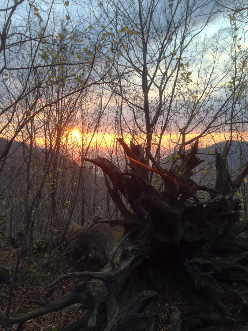 Мы прошли дальше по меткам, и нашли маленький грот, и проход «в другое измерение» между большими камнями. Дальше уходит хорошая тропа, и на карте был обозначен родник и другие интересные места. Но далеко уходить не стали, т.к. уже темнело, а обратный путь совсем не близкий. Полюбовались с заброшенных чайных плантаций красивым видом на морской закат и окружающие горы. Сократили путь через дачный поселок, и по бетонной дороге, уже в сумерках, спустились к реке и дошли до начала маршрута.