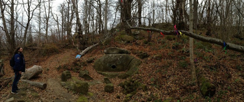 Сам дольмен достаточно колоритный, и в хорошей сохранности. Когда поднимались к нему, не отпускало ощущение сказочности места. Вокруг бурелом из поваленных вековых каштанов. Но похоже, маршрут не заканчивается здесь.