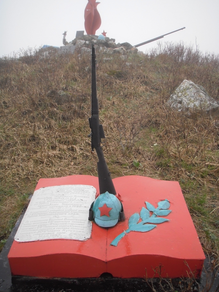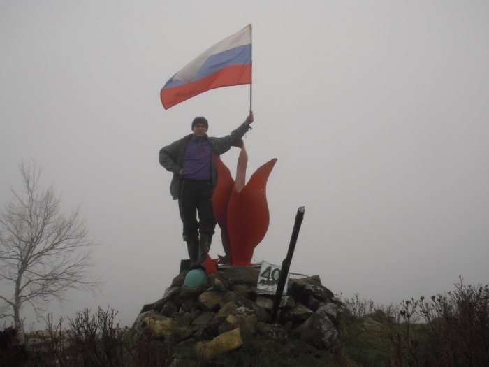 Добравшийся до перевала начался снег и пошел мелкий дождик. Фотографируемся, перекусываем, поминаем павших защитников сражавшихся в этих местах. Потом осматриваем памятники. Один в виде пламени и направленного вверх орудийного ствола — установленный к 40-летию Победы. Возле красного пламени лежит зеленая каска, из камней торчит силуэт танка и звездочка. На камнях есть несколько табличек, одна из них с подводной лодкой – защитникам перевала от комсомольцев I судоверфи ВМФ.