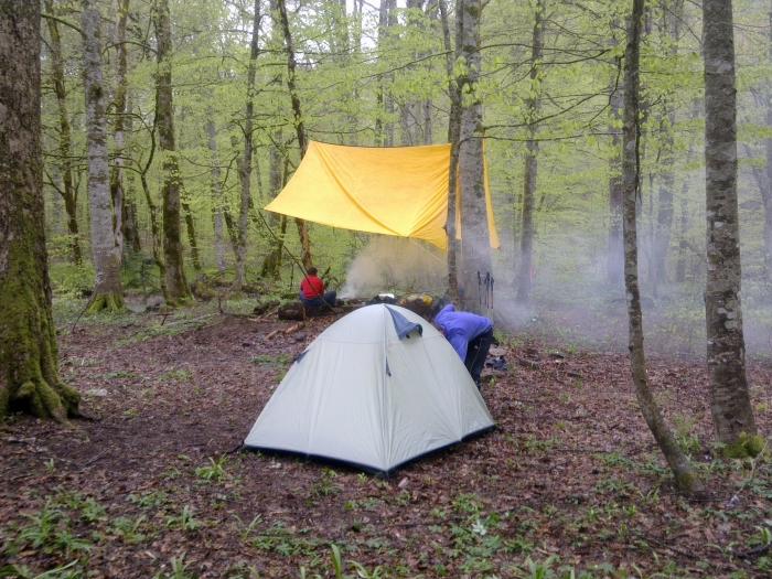 Вода в водопаде белая, вспененная все проходящие называют водопад «Молочным». Голодные холодные мокрые на сквозь мы решили разбить лагерь не по далеку от водопада в урочище Грачево. На слиянии рек облагороженное место столик скамейки место для палатки.