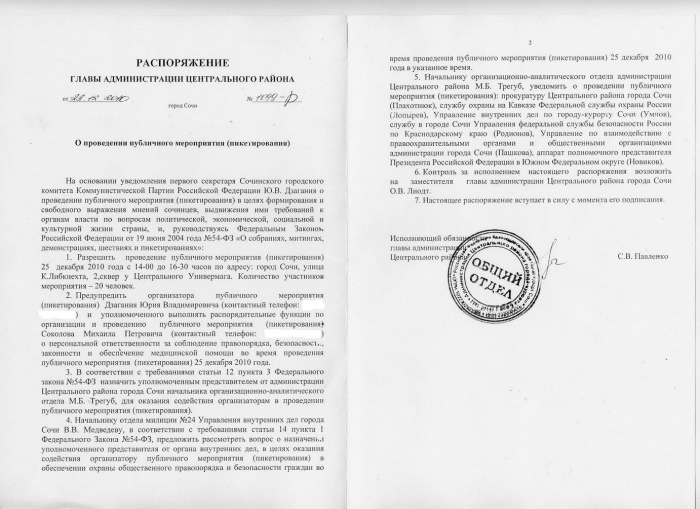 1. Итак, 13 декабря организатор пикета – Сочинское городское отделение КПРФ – обратилось с уведомлением в администрацию Центрального района (письмо исх. № 44 от 13.12.2010 на 2-х страницах (прилагается).