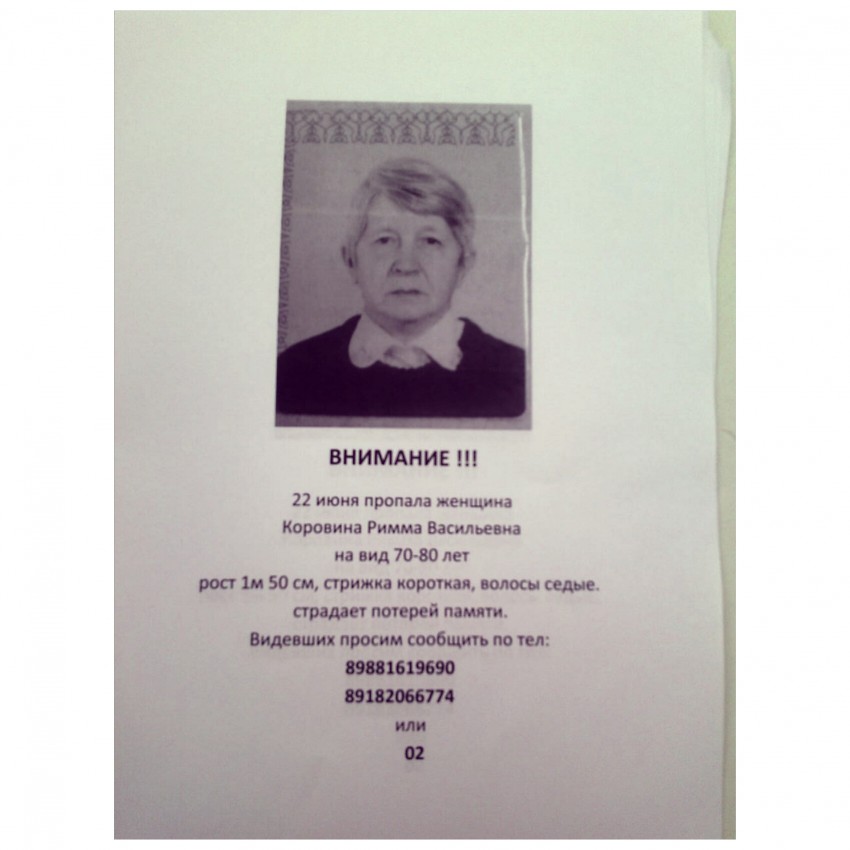 Приметы пропавшей: на вид 60-65 лет, рост 170-175 см, худощавого телосложения, волосы короткие, с проседью, глаза карие. Особые приметы: на передних зубах сверху весь ряд в позолоченных коронках.