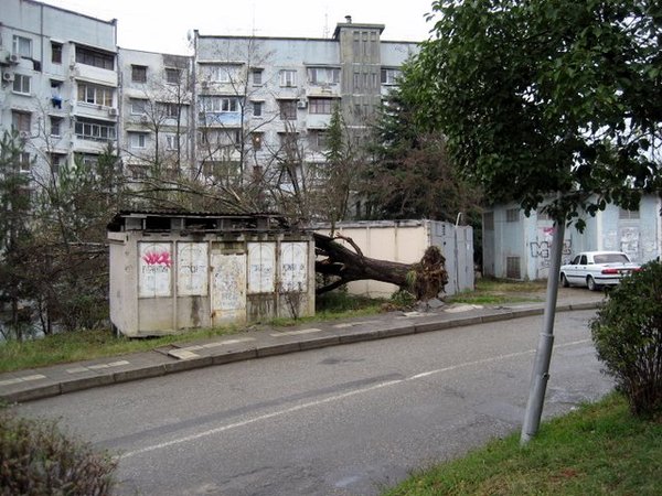 В УК Хоста обращались, вторые сутки меры не принимают. Никто не пришел. Опасаемся дождей. Могут пострадать дети, при падении стволов дерева с крыши. Вырваны бельевые кронштейны и козырьки.