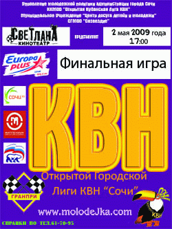 Летние каникулы впереди и для сочинских КВНщиков и любителей игры КВН финиширует четвертый сезон игр клуба «Открытая Городская Лига КВН — «Сочи». Кто станет Чемпионом клуба сезона 2008-2009 и кто будет представлять город Сочи в Кубке Чемпионов Кубанских лиг мы узнаем 02 мая 2009 года.