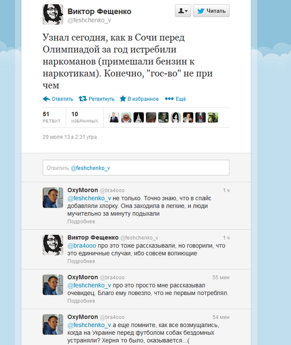 Ну вот откуда они это берут? Ведь вроде не полные дебилы, твитырями обзавелись.Сам этот Фещенко чо употребляет? Или я чего-то не знаю в силу своей далекости от наркоманских тем ?