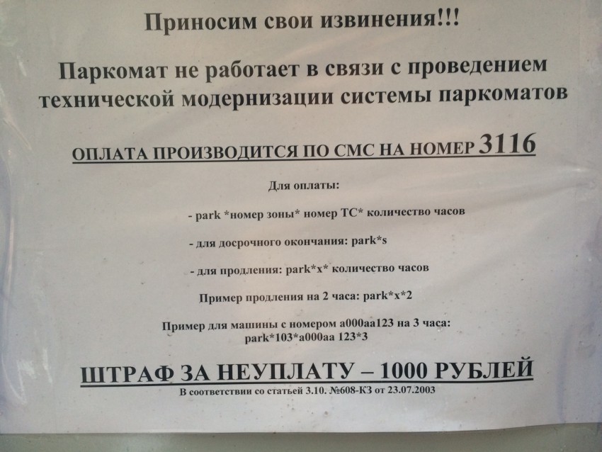 Сегодня столкнулся с безобразной работой (точней будет сказать отсутствием таковой) паркоматов на Ул. Роз. Редко удаётся припарковаться в центре у обочины, обычно паркуюсь на платных закрытых стоянках, поэтому что называется «не в теме». Просветите несведущего человека. Пошёл как порядочный оплатить парковку… Вот те раз… А экранчик то не работает, но я человек настойчивый...))) пошёл к следующему паркомату, он тоже не работал, но на нем хотя бы висело объявление следующего содержания:
