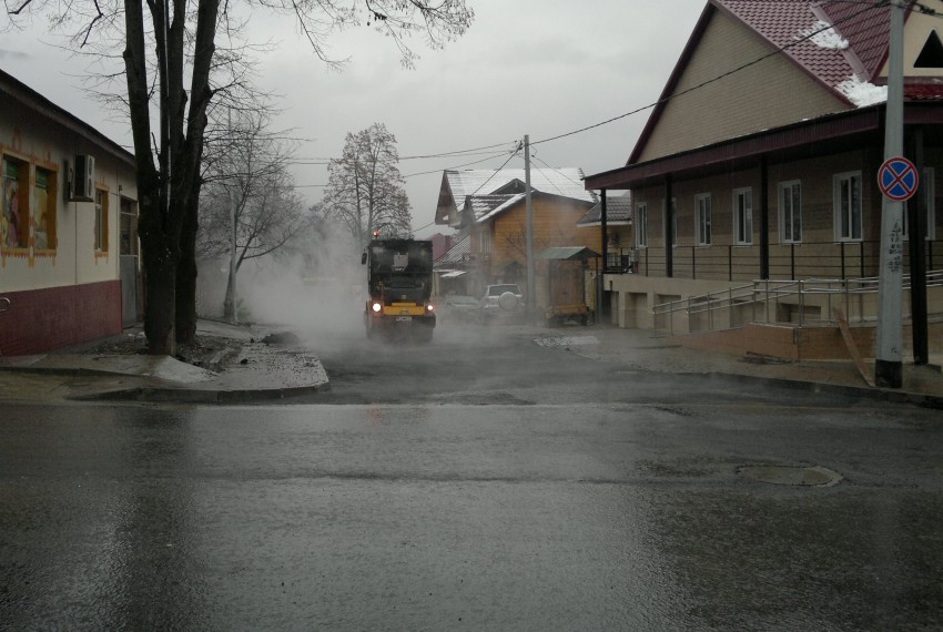 Это же такая романтика — укладывать асфальт под дождём. Красная Поляна, ул. Волоколамская.
