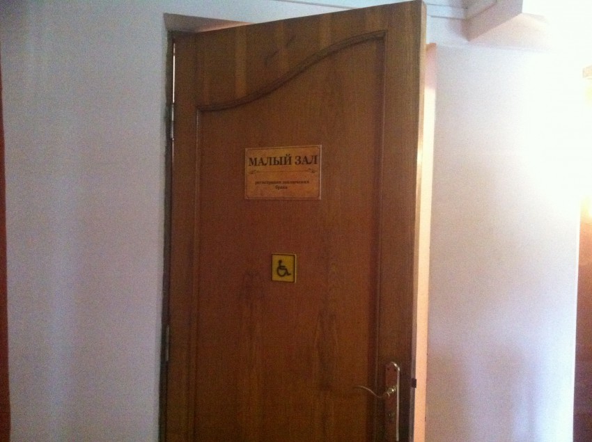 ЗАГС, дверь, табличка, еще одна внизу, непонятно к чему она там? (значёк инвалид) Дверь в комнату новобрачных…